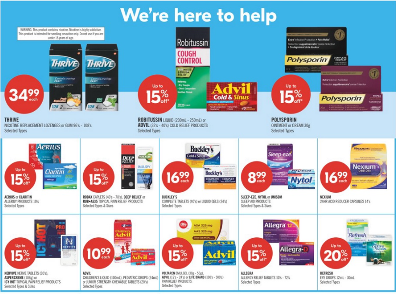 Shoppers Drug Mart Flyer Weekly Deals 30 April 2025 features essential health and wellness items at unbeatable prices. Firstly, kick the habit and support your journey with Thrive Nicotine Lozenges or Gum 96’s–108’s for only $34.99 each. Moreover, soothe cough and cold symptoms with Robitussin Liquid or Advil Cold & Sinus, both at up to 15% off. If you’re dealing with cuts or scrapes, stock up on Polysporin Ointment or Cream 30g, also up to 15% off. Certainly, these limited-time Shoppers Drug Mart flyer deals help Canadians care for their health affordably. Lastly, Buckley’s Complete Tablets or Liquid Gels are only $16.99 each, bringing fast relief when you need it most.